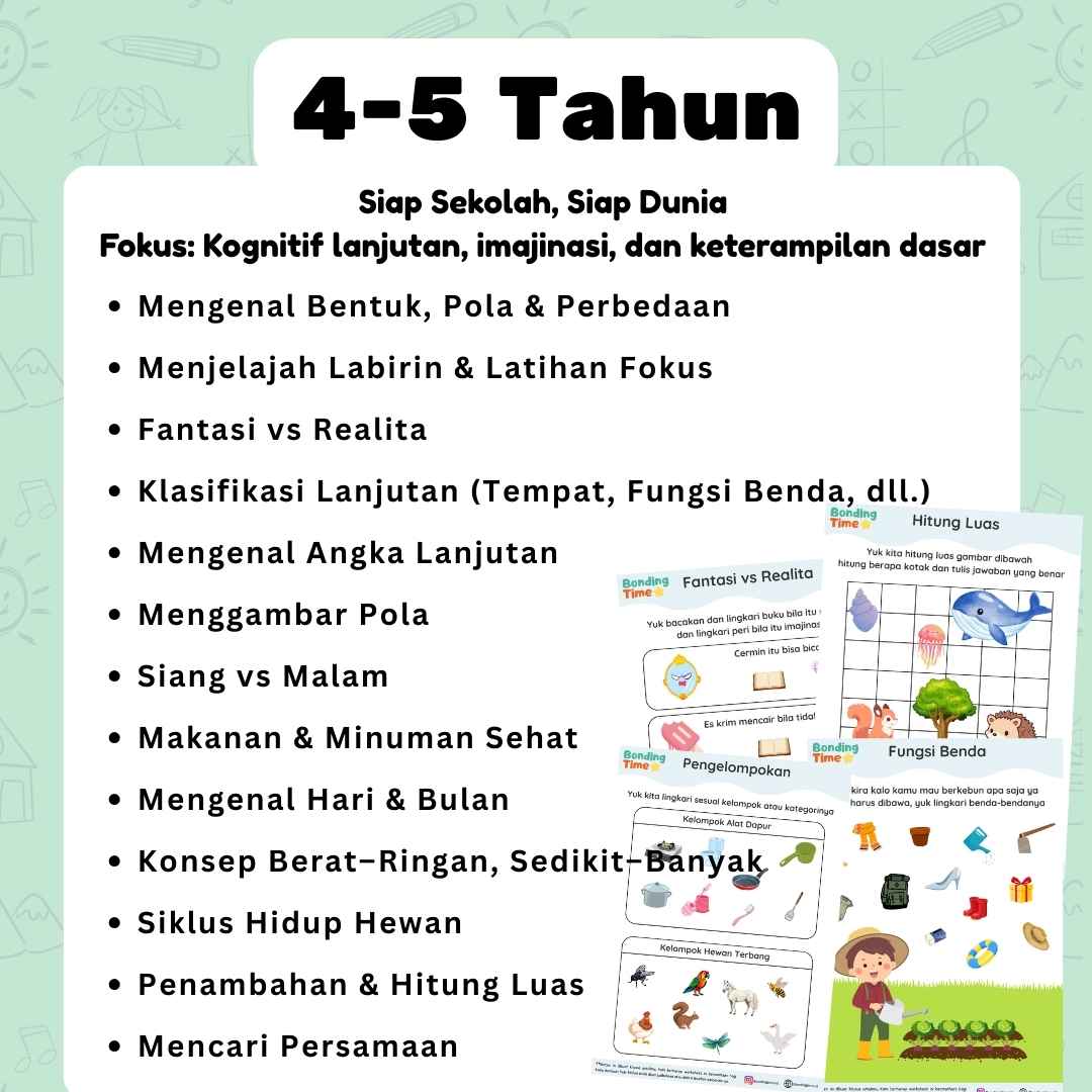 Aktivitas Matching, Konsep & Ukuran, dan Pengetahuan Umum membantu anak mengenal dan membedakan objek sehari-hari